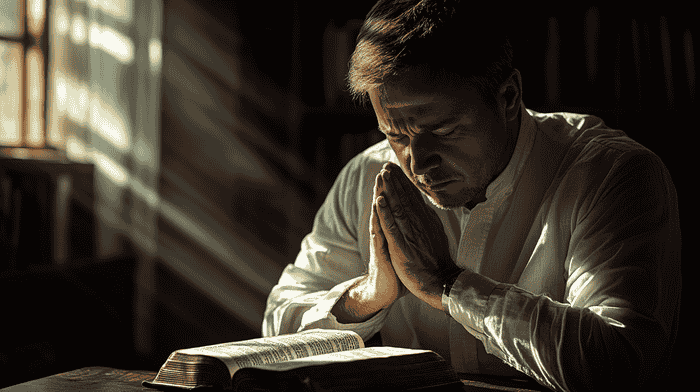 Person praying to God in difficult times (image generated with Midjourney)